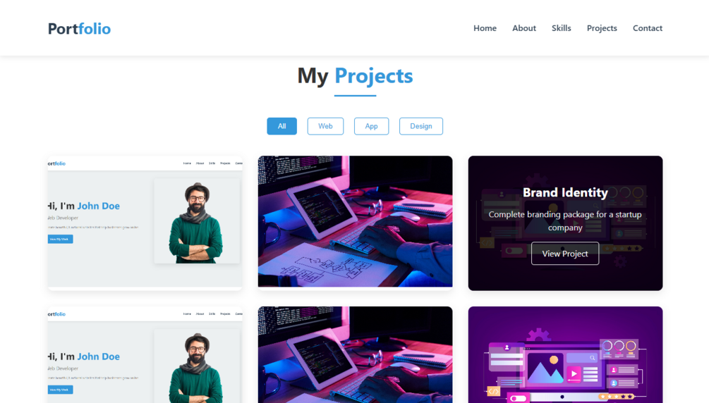 This modern and clean personal portfolio website is designed for web developers and digital professionals. It features a responsive layout with a sleek top navigation bar linking to Home, About, Skills, Projects, and Contact sections. The hero section introduces the developer with a friendly, professional photo and a bold headline: “Hi, I'm John Doe – Web Developer.”